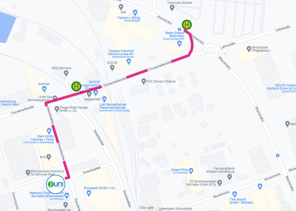 Mit der Buslinie 135 (Richtung Nordhafen) kommst Du von der Stadtmitte Mülheim an der Ruhr/ vom Hauptbahnhof Mülheim an der Ruhr zu uns. Ausstieg ist an der Haltestelle „Siemens“. Nach 500 Metern Fußweg (siehe Karte) erreichst Du dann die Junior-Uni.